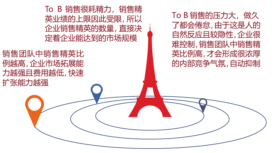 因为业绩能高出常人几倍以上的销售精英,几乎都来自于销售潜质本就卓越者,所以对这类人的甄别与吸引能力,决定了企业销售团队中销售精英的人数和所占比例,是To B类企业做大最重要的基础